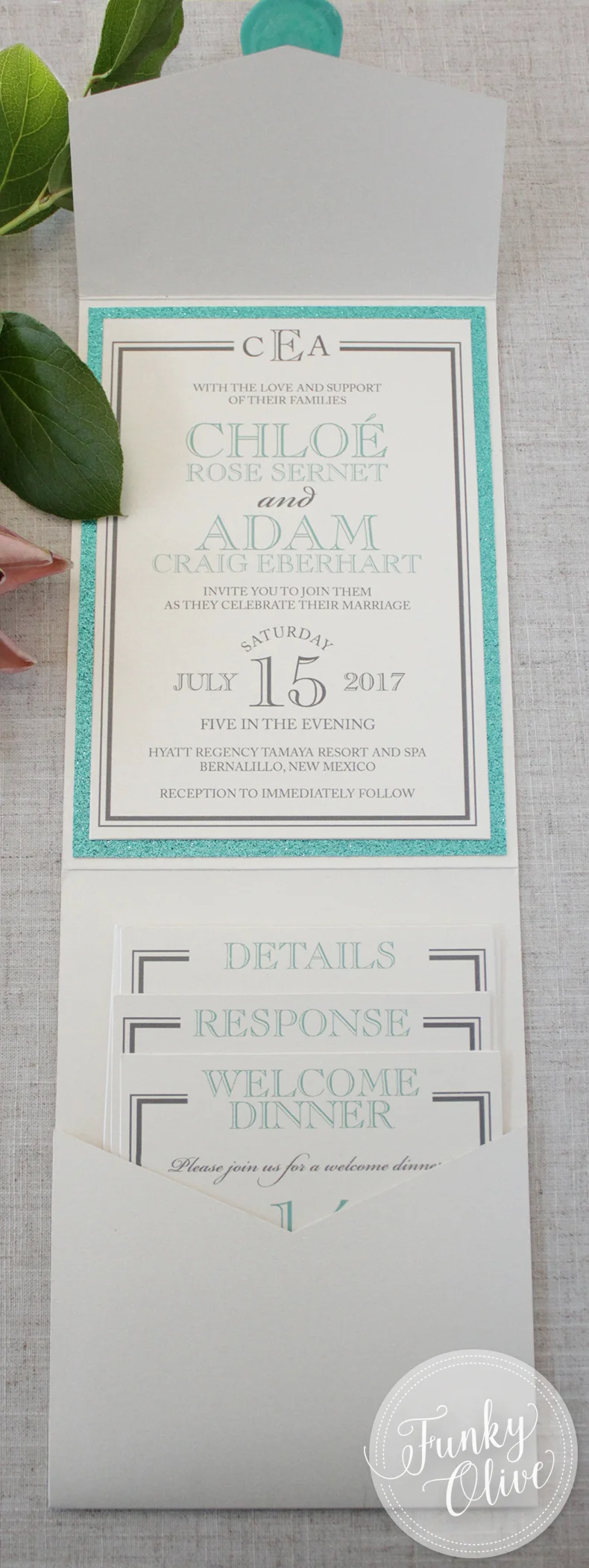 I seriously adore working with couples who know exactly what their vision is for their wedding day, and come to me knowing that I can make their ideas come to life! When a couple can feel truly at ease with me, and the design process, and let me do what I do best - that's when the magic really happens. Chloé & Adam were just such a couple! Chloé was a bride who knew exactly what she was looking for - a clean, modern, perfectly tailored look with a hint of sparkle and glamour. She knew she wanted a waterfall style pocketfold enclosure, with perfectly stacked inserts lovingly placed inside with precision and care. She knew she wanted the dreamiest, creamiest Pearlized Latte shimmer cardstock. She knew she wanted a little hint of glitter, and our Aqua glitter cardstock was the perfect choice. And she knew she wanted to seal everything up with a classic, Aqua shimmer monogram wax seal.