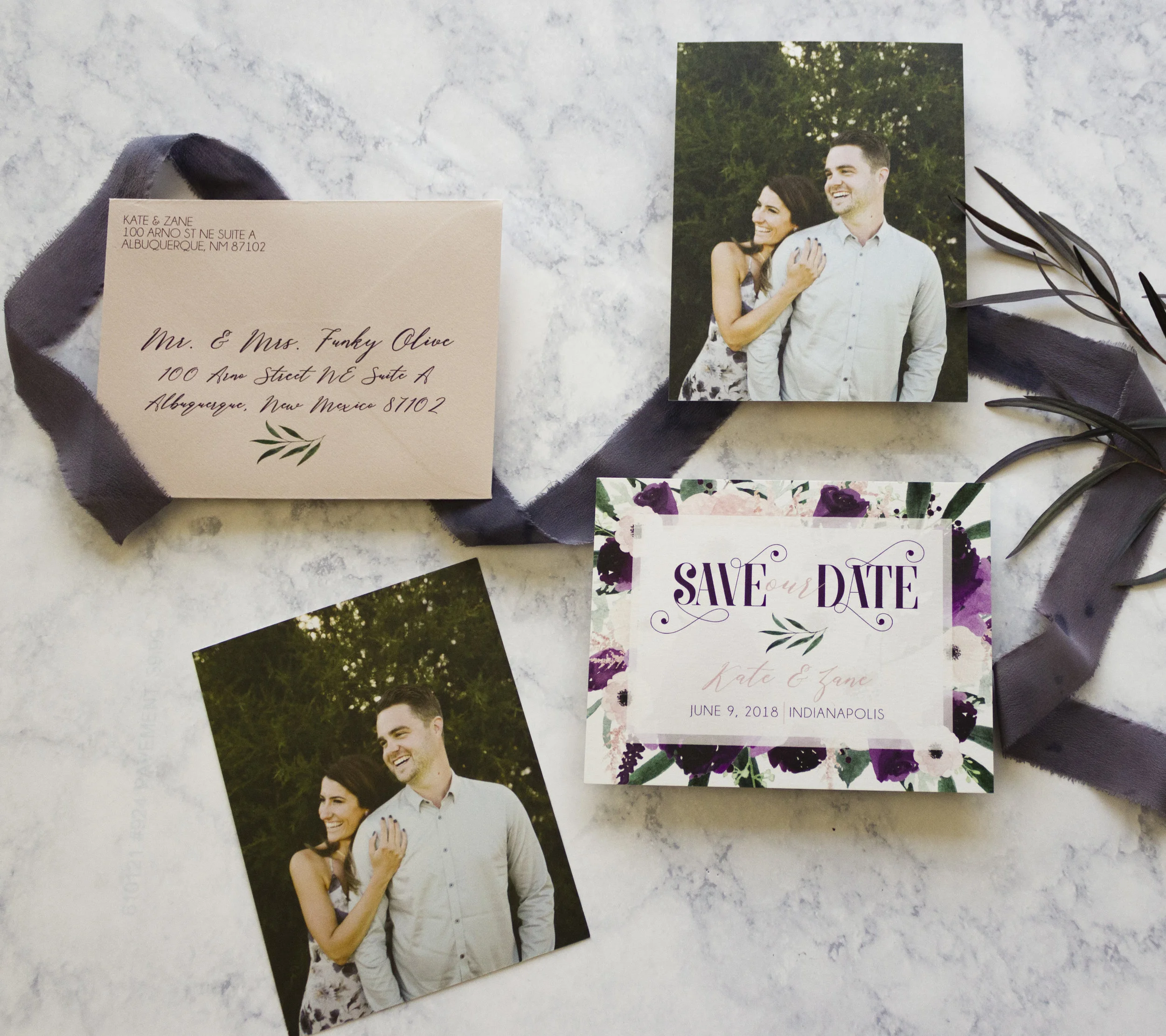 We started their design process with their semi- custom save the dates - which were based on a similar design, and we changed up their colors, fonts, and added a photo to really personalize them and tailor them for their wedding.